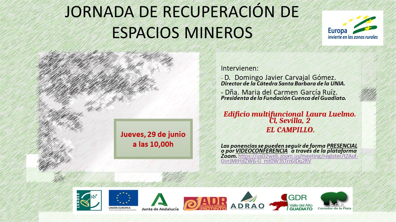 El próximo jueves 29 de junio, organizadas por el ADR CUENCA MINERA DE RIOTINTO, tendrá lugar la celebración de unas JORNADAS TÉCNICAS sobre “Recuperación de Espacios Mineros”, a cargo de los profesores D. Domingo Javier Carvajal Gómez. Director de la Cátedra Santabárbara de la UNIA y Dña. Maria del Carmen García Ruíz, Presidenta de la Fundación Cuenca del Guadiato. Las Jornadas se podrán seguir de forma presencia en el edificio multifuncional Laura Luelmo en calle Sevilla,2 (https://goo.gl/maps/a8kZNAKeoiALgZsHA) de El Campillo; o si se lo prefiere, puede ser seguido por videoconferencia a través de la plataforma zoom, cliqueando en el siguiente enlace.